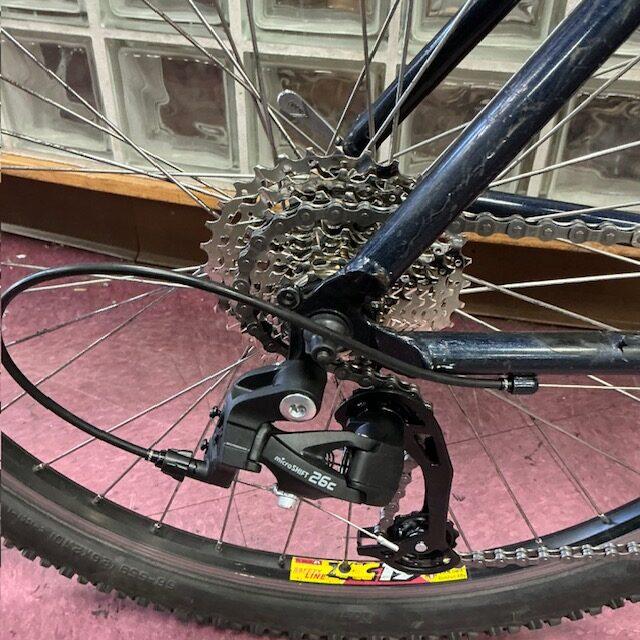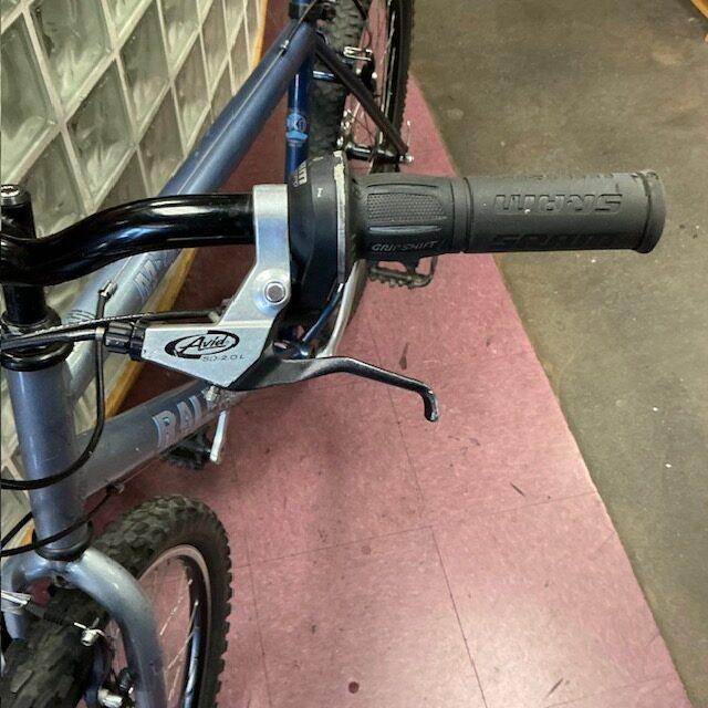 Used Raleigh M-40 Mountain bike for sale. It has just been serviced in our shop and comes with new brakes, cassette and chain. 3×7 gearing, extra large oversize Chromoly tubing and Sram twist shifters. It measures 19.5″ from the middle of the crank to the top of the seat post collar.
