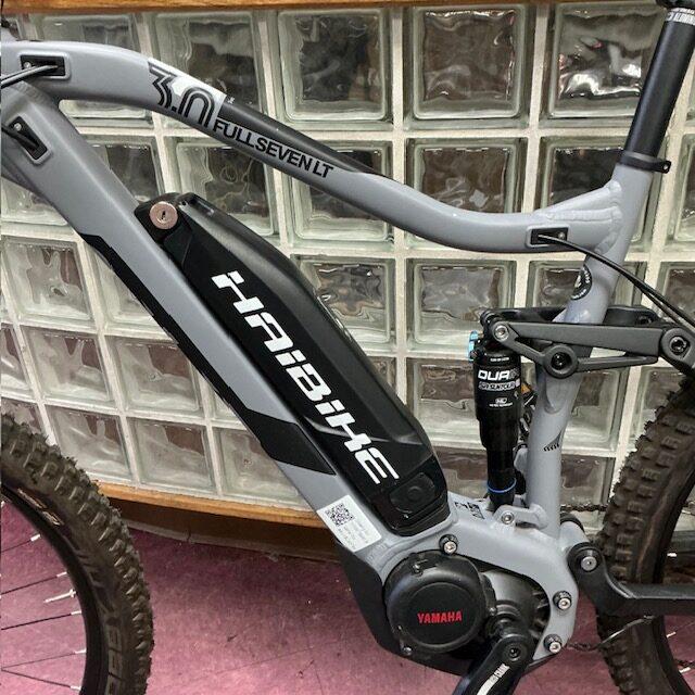 Used Hai Bike Full seven LT 3.0 Electric Mountain Bike for sale in our store. It is practically brand new with on 56 miles on it. Best for tall riders. It comes with a Yamaha Drive System and battery and has a max pedal assist speed of 20mph. Suntour suspension, Shimano Deore M6000 shifters, Tektro Orion brake levers and Yamaha Slide Switch display. It is a 1×10 speed.